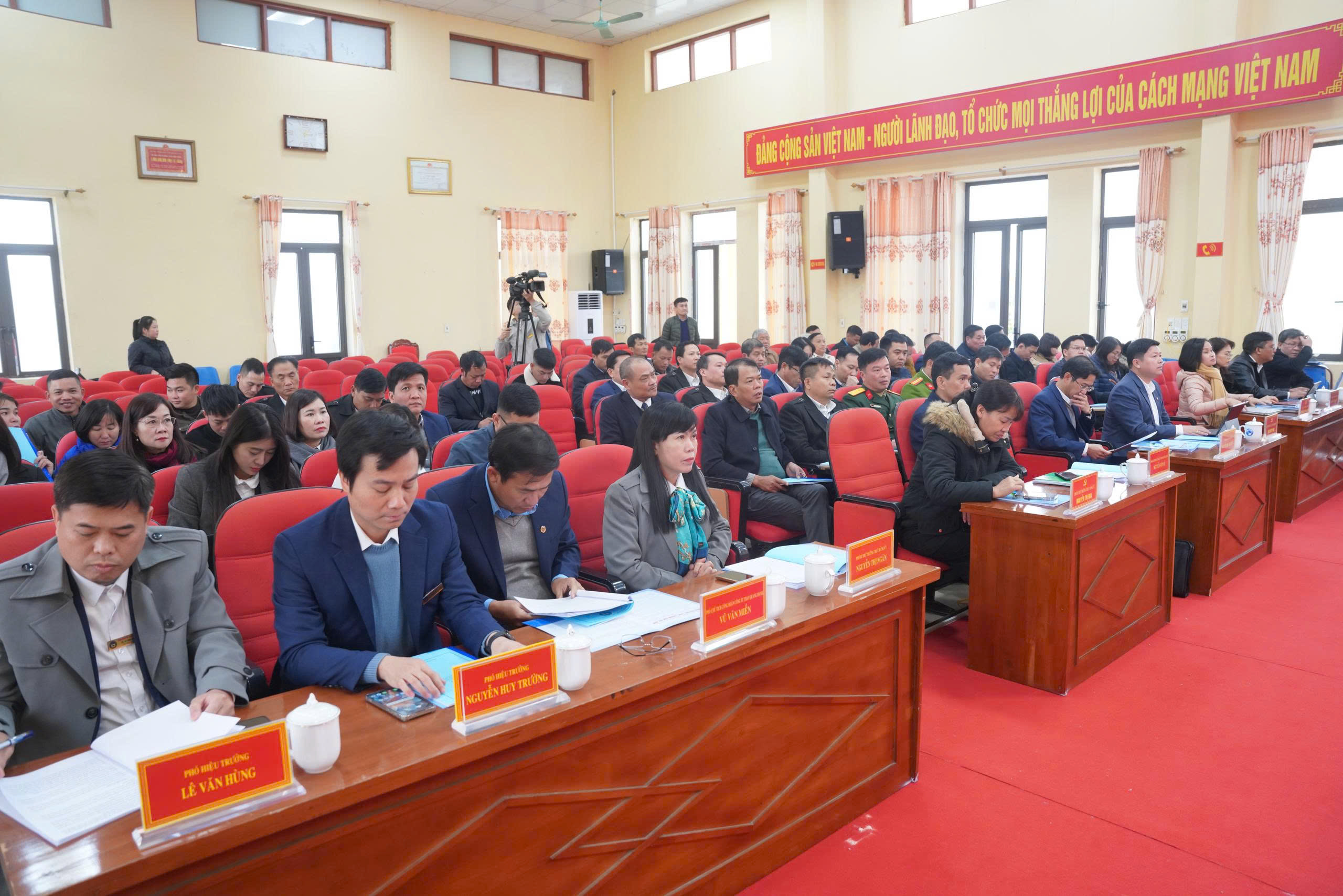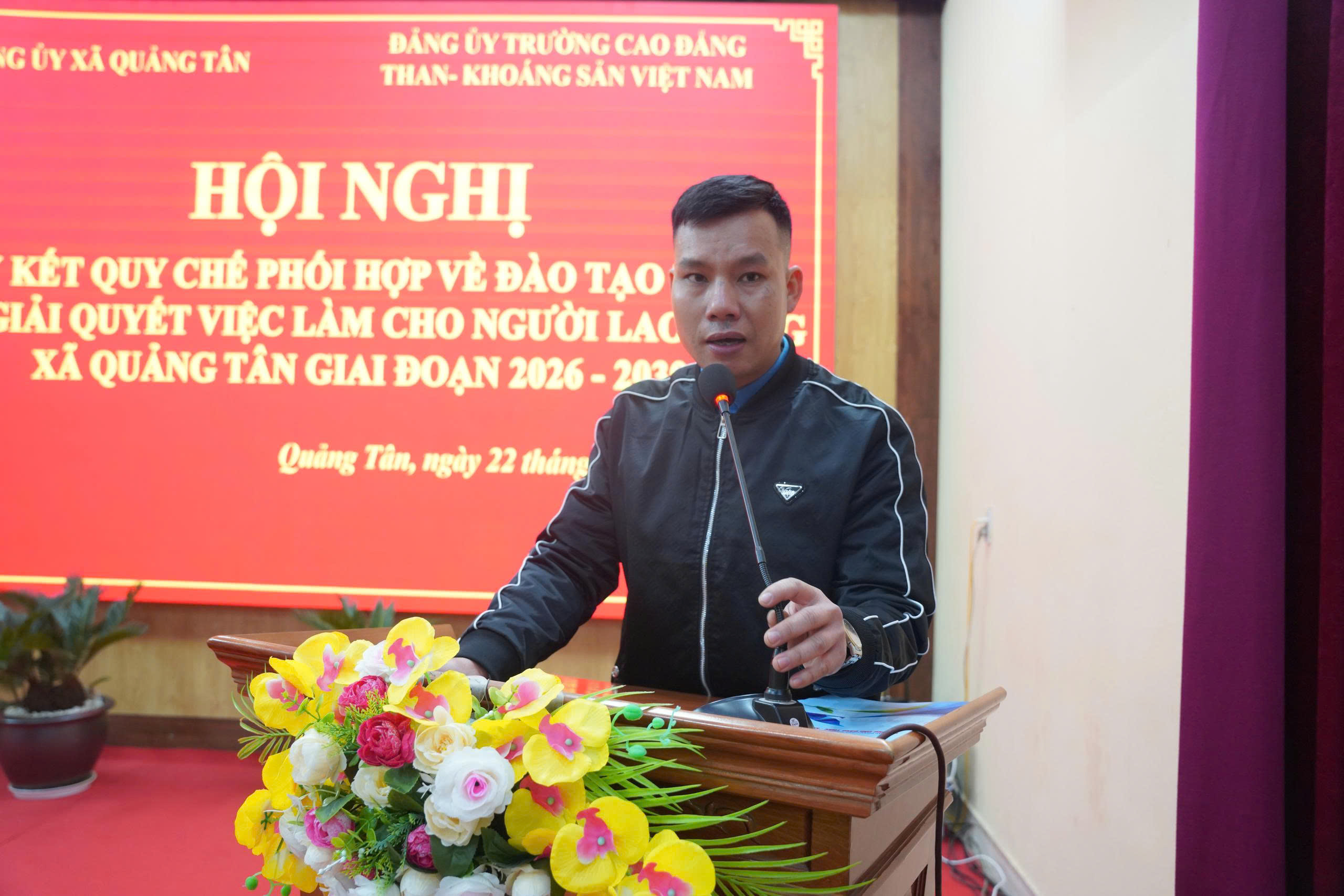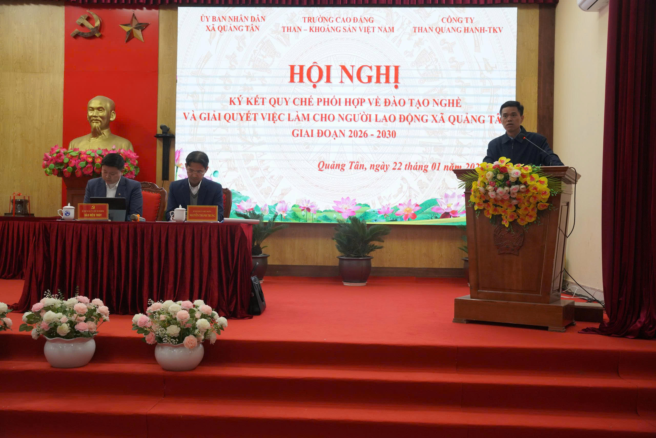 Tham dự hội nghị, về phía xã Quảng Tân có đồng chí Đào Biên Thùy – Bí thư Đảng Ủy, Chủ tịch HĐND xã cùng các đồng chí lãnh đạo UBND, Cán bộ Xã và 31 Bí thư chi bộ, Trưởng thôn/bản của Xã Quảng Tân; Về phía Trường Cao đẳng Than – Khoáng sản Việt Nam có đồng chí Nguyễn Thành Trung – Bí thư Đảng ủy, Hiệu trưởng trường, các thầy cô giáo trong Ban giám hiệu nhà trường…và đoàn công tác Công ty than Quang Hanh – TKV do đ.c Nguyễn Văn Sỹ – Phó Giám đốc Công ty làm trưởng đoàn cùng các đ.c đại diện Công đoàn; ĐTN; các phòng chuyên môn…của công ty.